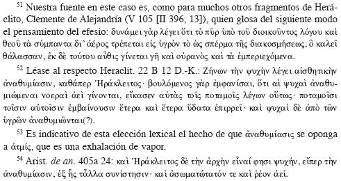,52 término que la define por cierto como una exhalación caliente y seca, presumiblemente por parecerle esta condición, con todo y que tiene en el agua su punto de partida, la única congruente con la naturaleza ígnea de su principio.53 Aristóteles, por su parte, en un recorrido por las diferentes concepciones del alma sostenidas por los pensadores antiguos, confirma la interpretación anterior de la doctrina de Heráclito, en el sentido de que el alma, visualizada como una exhalación caliente o