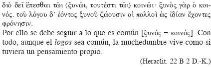 del que todo mundo participa. Éste, en efecto, parece ser el sentido que con mayor probabilidad se puede atribuir al fragmento identificado como el exordio del escrito de Heráclito,58 donde echa en cara a los hombres su carencia de entendimiento antes y después de haber escuchado el