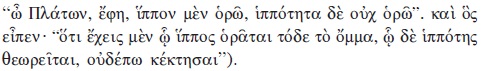 . El segundo género del ser ("cualificado") se remonta a una discusión que, según Simplicio, tuvo lugar entre Antístenes y Platón. La objeción de Antístenes era la siguiente: "Veo 'caballo', pero no veo 'caballidad' ", a lo que Platón replicó: "porque tienes aquello con lo cual se ve 'caballo', a saber, este ojo, pero aquello con lo cual se contempla 'caballidad' aún no lo posees" (Simplicio, In Cat., 208, 30-32:
