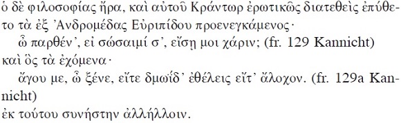 Pero él sentía pasión por la filosofía, y Crántor, que se sentía atraído amorosamente por él, le preguntó citándole las palabras de la Andrómeda de Eurípides:
