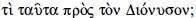 Plutarco reseña que ya en el siglo v el público asistente a los espectáculos del drama se preguntaba ante el desarrollo temático de las tragedias: "¿En qué atañe esto a Dionisio?"2 Esta pregunta, que se convirtió en un refrán, ha sido entendida y explicada por la mayoría de los exegetas, siguiendo precisamente el comentario de Plutarco, en relación con el origen religioso del teatro, propiamente del ámbito dionisiaco,3 lo que, en principio, podría parecer obvio.4