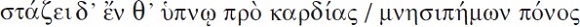 ), a ser capaz de refrenar la hybris. Y, como hemos visto, el pathos cobra presencia inmediata como síntoma de la tragedia: "Del corazón gotea en el suelo una pena dolorosa de recordar" (