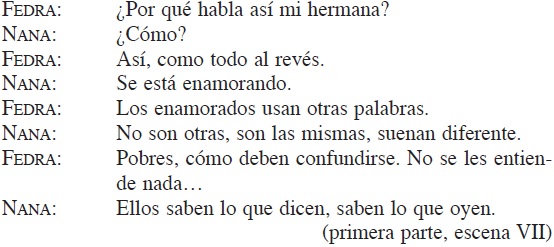 En la intervención de la Nana, Escalante cita, reutilizándolas, una intervención de Phaedra y otra de la nutrix. Tanto Séneca como la dramaturga mexicana dan a "praeceps" / "precipicio" el mismo sentido figurado de "ruina moral" (sentido figurado que es casi un lugar común) y subrayan que Phaedra / Fedra se precipita "sciens" / "a sabiendas", esto es, con conocimiento y deliberación, si bien lo hacen desde perspectivas distintas. En la tragedia latina, íntimamente sabe la reina que, deseando a Hippolytus, se dirige al precipicio y así lo expresa. En la pieza contemporánea Fedra también lo sabe, pero es su Nana quien le señala que, al desear a su hijastro, se encamina a la perdición.39