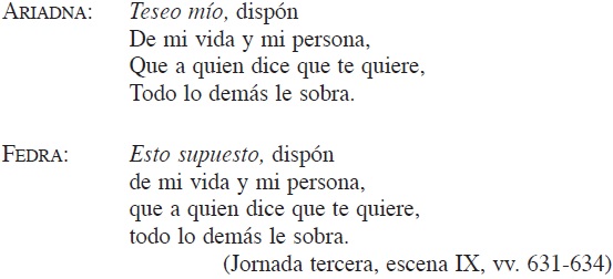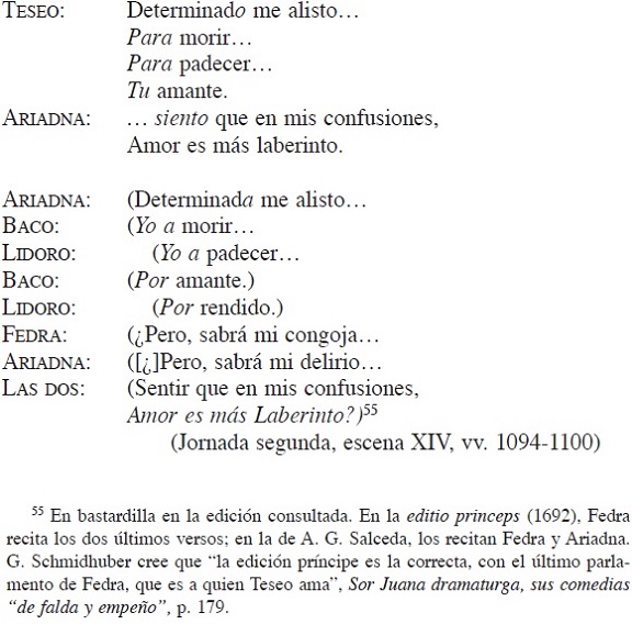 55 En bastardilla en la edición consultada. En la editio princeps (1692), Fedra recita los dos últimos versos; en la de A. G. Salceda, los recitan Fedra y Ariadna. G. Schmidhuber cree que "la edición príncipe es la correcta, con el último parlamento de Fedra, que es a quien Teseo ama", Sor Juana dramaturga, sus comedias "de falda y empeño", p. 179.