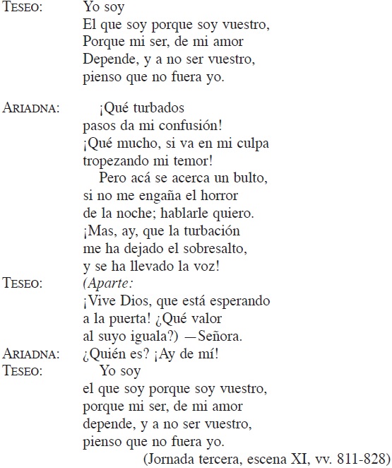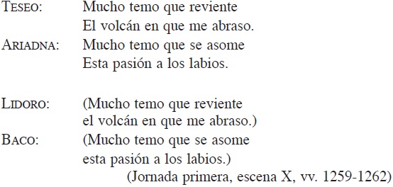 En la escena sexta de la primera parte de la obra de Escalante intervienen Teseo y Ariadna que, según la acotación, están "lejos, detrás de unos árboles":48