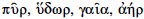 ), mar, el Tártaro brumoso, etc. Probablemente la suya no sea una idea original, sino deudora de una tradición antiquísima en la cual el origen del universo se concibe a partir de un caos inicial que está, a su vez, dividido en cuatro ámbitos diferenciados y regulados por diversas potencias divinas (al centro, la Tierra rodeada del Océano; sobre la Tierra, los cielos y debajo, la oscuridad y la noche). Sin embargo, es en Empédocles donde aparece atestiguado por primera vez el conjunto de los cuatro elementos: