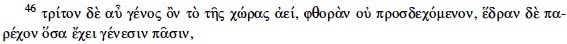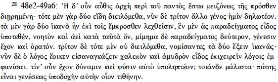 El texto que analizaremos sigue a una explícita presentación de la anánkē y a un reconocimiento de que ella, entendida como una forma errante de causalidad, debe ser tenida en cuenta también como un factor causal natural. Es la conciencia de esa ausencia, la del factor causal errante o anankástico, que no había sido tenido en cuenta en el "primer relato" de Timeo (desde 27d en adelante), la que obliga a comenzar de nuevo en busca de algo más, un "tercer género" o principio. Dice entonces Timeo, en 48a7: