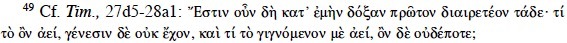 47 La conexión entre este parcial ocultamiento de los principios superiores aludido por Timeo con el célebre pasaje de Teeteto, 202c y ss., como así también con el significado general de la discusión a propósito del "sueño" de Sócrates al final de ese diálogo, es una tarea pendiente.