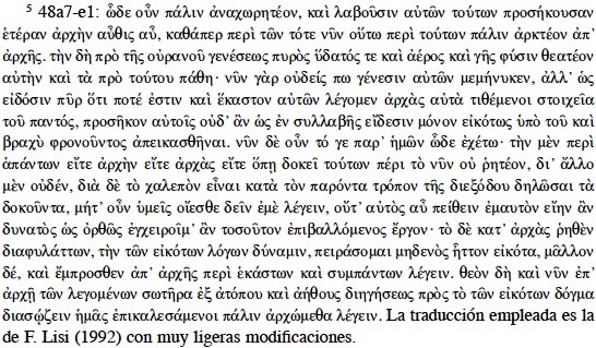 Debemos reiniciar por ello nuestra tarea y, tal como hicimos anteriormente, empezar ahora otra vez desde el principio, adoptando un nuevo principio adecuado a esta perspectiva. Tenemos que considerar la naturaleza del fuego, agua, aire y tierra y su estado antes de la creación del universo, pues creo que nadie hasta ahora reveló su origen, sino que, como si nos dirigiéramos a quienes ya saben lo que es el fuego y cada uno de ellos, los llamamos principios y los hacemos elementos del universo, aunque quienquiera que tenga un poco de inteligencia debería utilizar dicha similitud sólo de manera aproximada, y no como si se tratara de tipos de sílaba. (48c2) Pues bien nuestra posición es la siguiente. Ahora no he de hablar ni de principio ni de principios de todas las cosas ni de lo que me parece acerca de ellos, no por nada, sino por lo difícil que es demostrar lo que creo en la forma presente de exposición, y ni ustedes creen que sea necesario que yo lo diga, ni yo sería capaz de convencerme a mí mismo de que actuaría correctamente si me propusiera tamaña empresa. Teniendo presente lo dicho al comienzo de la exposición respecto de la fuerza de los discursos verosímiles, intentaré uno no menos verosímil sino más, incluso anterior al que procede del principio y procuraré disertar acerca de cada uno de ellos en particular y acerca del conjunto. Recomencemos el discurso, después de invocar también ahora, al principio de nuestra disertación, al dios protector para que nos conduzca sanos y salvos de esta exposición rara y desacostumbrada a la doctrina probable.5