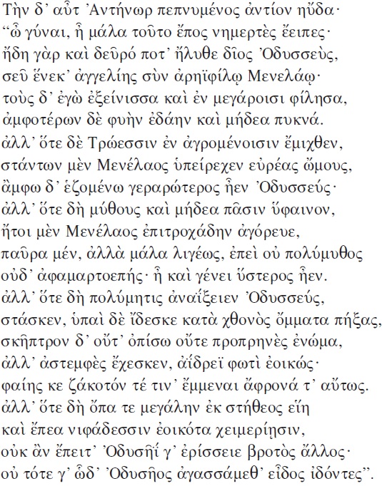 Ai vv. 203-224 del libro III dell'Iliade Antenore, vecchio con sigliere del re Priamo, ricorda ad Elena quando, prima dell'assedio di Troia, aveva accolto Menelao ed Ulisse, giunti in ambasceria per regolare amichevolmente le controversie tra Greci e Troiani:5