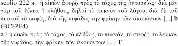 Lo scoliaste del v. 217 dei manoscritti A, b e T scrive: