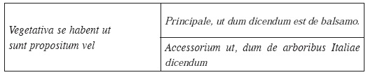 Valadés reproduce lo anterior como sigue: Omnia vegetativa sunt morti obnoxia, et se habent ut [sunt] propositum principale: ut dum dicendum est de balsamo, vel ut accessorium ut <cum> [dum] de arboribus Italiae, <vel Indiae>, donde los corchetes indican adición, y los paréntesis angulares, supresión. En este caso, los cambios afectan poco el contenido, aunque dificultan la lectura.