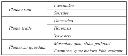 Dijimos que las hierbas son aquellas que no son leña o no producen madera. Arbustos los que no alcanzan las dimensiones propias de los árboles. Las plantas se clasifican en fecundas y estériles. Las plantas son de tres especies: doméstica, hortense y silvestre. Algunas de las plantas son machos, las que germinan más rápido, o hembras, las que echan hojas más grandes.