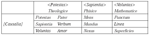 El cuadro de la retórica seudoluliana es el mismo, excepto porque no incluye la palabra causalia (que ponemos entre corchetes, para indicar que es agregado de Valadés) y porque repite los predicados en la primera fila que aparecen entre paréntesis angulares, para señalar supresión.