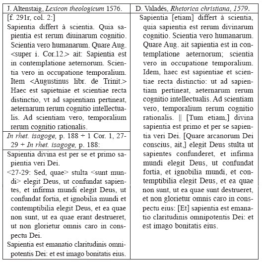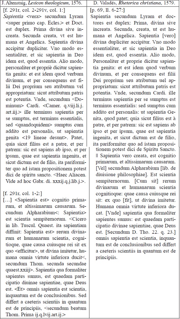 Ahí termina la explicación de la potestas y sigue la de la sapientia. Valadés introduce a renglón seguido un amplio párrafo sobre la sabiduría. Pero tampoco toma este pasaje de su fuente principal, sino del Lexicon theologicum de Jean Altenstaig, publicado a inicios del siglo XVI y reeditado en Venecia en 1579. De cualquier modo, al final introduce algunos renglones del In rhetoricam isagoge, como ha hecho en la sección anterior. Nos permitimos hacer un cotejo entre los pasajes del Lexicon de Altenstaig del que copió nuestro autor, en la primera columna, y el pasaje de Valadés, que reproducimos en la segunda. Los paréntesis angulares en el original y los corchetes en la copia de Valadés indican respectivamente las palabras o frases suprimidas y agregadas por el autor novohispano.