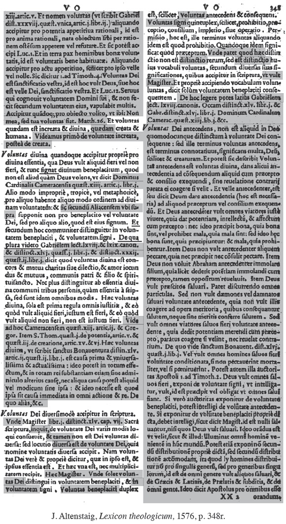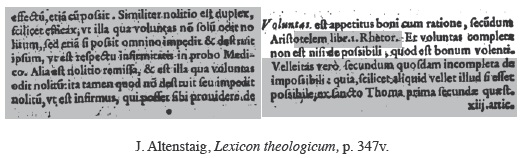 Valadés continúa (siempre a renglón seguido) con la voluntas, a la que dedica 40 líneas, mientras que Remigio Rufo la trata en ocho, repitiendo el mismo procedimiento que antes hemos descrito. La mayor parte de esta sección es una reproducción de tres entradas de la voz Voluntas del Lexicon theologicum, y sólo las últimas cinco líneas del In rhetoricam isagoge. En este caso, la reproducción es más ordenada, pues primero copia de la primera entrada de Voluntas, al final de la página 347v, y continúa copiando de las siguientes dos entradas, como podemos observar en nuestra reproducción del final de la página señalada (aquí abajo), y la siguiente del Lexicon (p. 191), indicando con sombreado las partes que Valadés no copió, y en subrayado los lugares donde hizo cambios.