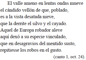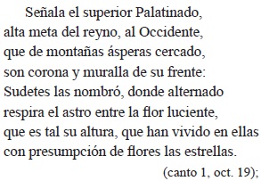 Cada una de estas dos octavas es una hermosa miniatura paisajística: las altas montañas que coronan y amurallan el valle del Palatinado, tan altas que el sol ("el astro") parece lucir entre flores que semejan estrellas y estrellas que semejan flores. En la segunda octava se presenta el rebaño de ovejas, tantas que con sus lentos y acompasados movimientos brindan "ondas" al valle; tantas que parecen nieve que, derretida, corre al llamado del pastor. En el valle pasta también el toro, aludido en una muy gongorina perífrasis mitológica: por el robo de aquel "mentido" toro, su especie quedó obligada (vincular en el uso forense de Góngora) a solo contemplar ("repetir los robos con el gusto") el paso del rebaño.