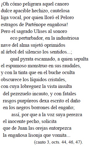 La primera octava alude al seductor canto de las sirenas, cifradas en una de ellas, Parténope (se arrojó al mar y las olas depositaron su cuerpo en la playa, a las faldas del monte Peloro, en Nápoles), y a la estratagema de Ulises de atarse a los mástiles para disfrutar el canto, sin arrojarse al mar. Mejor y nuevo Ulises resulta san Juan Nepomuceno (el "sagrado Ulises") que responde a los falsos halagos del rey ("sonoro eco perturbador", equivalente al canto de las sirenas) con el silencio, gracias a su grandeza de alma ("en la industria... sentidos"). Establecida la alegoría mitológica y náutica, las siguientes estrofas desarrollan la lucha del santo a la manera de un naufragio: el rey se compara con una serpiente marina ("pirata escamado"), escondida en los raudales del mar ("espumoso monstruo"), que ataca a los pececillos con la tinta que esconde en el buche y deja huellas de su mal en la púrpura disuelta en el agua; así, el rey, con "la engañosa lisonja que vomita", pretende confundir al santo. Como se ve, una comparación bastante apretada y bien trabajada.