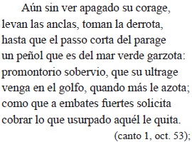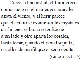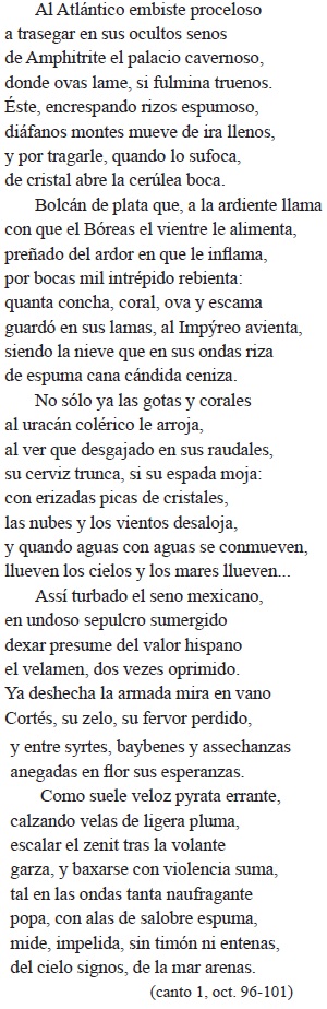 Notemos el léxico (ovas, cerúleo, espuma cana, undoso sepulcro), la eficaz perífrasis mitológica del palacio cavernoso de Anfitrite (por la profundidad del mar), la viveza de las imágenes que pintan la furia del océano: en la primera octava, el océano, "encrespando rizos espumoso", embiste las naves de Cortés con iracundos montes de agua (diáfanos), las sofoca y se las traga abriendo "de cristal cerúlea boca"; en la segunda, el Atlántico se presenta cual "volcán de plata", inflamado de ardor por el viento, revienta, lanzando al cielo conchas, corales, tesoros a los que, a su vez, ofrece "cándido" sepulcro en su crispada espuma. El mismo océano provoca la tormenta que se desata en "erizadas picas de cristales"; todo es confusión, bien expresada en el último verso de la tercera octava con la reiteración del verbo en el quiasmo: "llueven los cielos y los mares llueven" (por este doble "hundimiento", más adelante dice el poeta que el velamen fue "dos veces oprimido"). En la última octava de este pasaje, el autor elabora una comparación original: como el ave de rapiña vuela hacia lo más alto para luego descender velozmente sobre la garza, así las destrozadas naves (sinécdoque por Cortés y sus hombres) lanzan su mirada al cielo, inquiriendo lo que les depara, y hacia la costa, anhelando tierra firme. La relación con el ave de rapiña pone en primer plano no solo la velocidad con que se mueve la mirada, sino la avidez, la ansiosa angustia. Tras el temporal, una de las naves de Cortés "ruina es del Noto, si de la agua astilla" y los sobrevivientes "parabienes se dan, y discursivos / no se ven muertos y se dudan vivos".