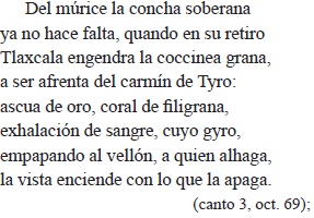La cochinilla (su nombre náhuatl es nocheztli) es un insecto que se cría en los tallos de las tuneras o nopales, de ahí el verso "a quien bárbara planta dio pungente", con el cultismo pungente, 'que punza'; de él se extrae un tinte grana, émulo (imitador/ rival) de la púrpura del múrice. La definición de púrpura en el Diccionario de Autoridades aclara los versos "que, en avara garganta, infiel retira / un pezesillo que las ondas gira": "pescado de concha retorcida como la del caracol, dentro de cuya garganta se halla aquel precioso liquor roxo...". Lo que sigue es una alusión a los amores de Hércules y Deyanira, y al trágico final del héroe a causa de la capa teñida con la sangre del centauro Neso (de ahí la relación con púrpura).