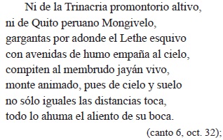 En otra parte, Reina Zeballos relata que el rey Wenceslao pretende convencer a san Juan Nepomuceno de que revele los secretos de la reina, pues era su confesor, "así llamando a Juan con rostro afable / (que dexa a espaldas el de sus rencores), / hypócrita volcán, sereno mueve / con blando aliento la mentida nieve" (canto 3, oct. 43). El rey esconde su furia con palabras blandas y lisonjeras (la "mentida nieve" que no corona al volcán en erupción). El poeta, entonces, para expresar con la elocuencia del caso el peligro al que se enfrenta el santo, recurre a una afortunada comparación, al estilo del poeta cordobés: