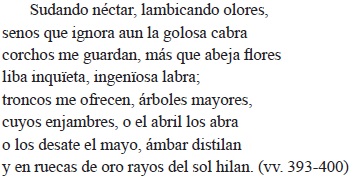 Con todo derecho, el pasaje de Gil Ramírez se inserta en esta tradición: la miel, "don tan sagrado como precioso", formada como pensaban los antiguos a partir de las gotas de rocío, "destellos que Flora en granos athesora bellos", las imágenes del intercambio comercial entre el cielo y la tierra "en fragatas de rosa", de la abeja "cual pyrata alado" en "occéanos de púrpura y de nieve", que como pirata que se respeta ambiciosa, ansiosa, ávida, roba esos tesoros que luego, artificiosa, cuidadosa (afortunado cultismo el argumentosa) convierte en "dulce miel" y "cera luminosa":