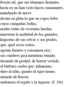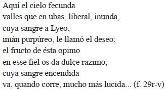 Gil Ramírez refrenda esta particular lección gongorina en la presentación de la riqueza ofrecida por Oaxaca, a saber, la "púrpura indiana" o cochinilla: "Este a quien presta el cielo generoso / rústica cuna en su rosado oriente, / múrice occiduo de valor precioso, / a el tirio y el sidón émulo ardiente..." (f. 23v). Véase el primoroso y espacioso esmero de su descripción: