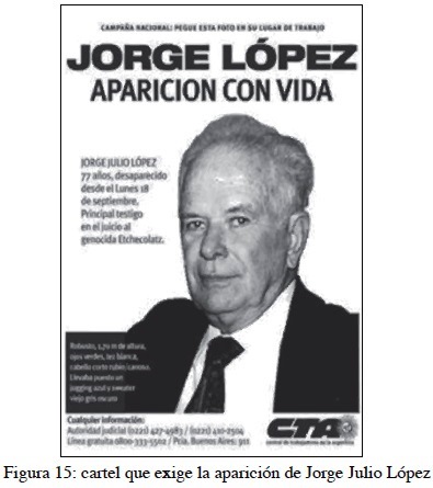 24 Jorge Julio López (General Villegas, Buenos Aires, Argentina, 1929 - Desaparecido el 18 de septiembre de 2006), albañil argentino. Fue detenido ilegalmente y llevado a distintos centros clandestinos de tortura durante la dictadura militar. En 2006, derogadas las leyes de Obediencia Debida y Punto Final, el Comisario Miguel Etchecolatz fue el primer acusado por la represión ejercida en la provincia de Buenos Aires. Jorge López fue querellante en la causa y un testigo clave, ya que sus declaraciones involucraban a 62 militares y policías. Debido a su testimonio, Etchecolatz fue condenado a cadena perpetua. Luego de esta condena, López fue desaparecido el 18 de septiembre de 2006, en la ciudad de La Plata. Ni el gobierno nacional ni el gobierno provincial han obtenido ningún éxito en sus pesquisas. Los Organismos de Derechos Humanos han planteado desde un comienzo que la desaparición de Jorge Julio López involucra a miembros de fuerzas de seguridad retirados y en actividad. En 2007, la diputada nacional Nora Ginzburg presentó un proyecto de ley que, en su artículo primero, solicitaba la conformación de una "comisión bicameral especial destinada a mantener informado al Congreso de la Nación sobre el desarrollo de las investigaciones relacionadas con su secuestro y desaparición. El proyecto no avanzó. Poco después presentó un proyecto de resolución solicitando un pedido de informe al Poder Ejecutivo respecto de los casos de López y Gerez. Su presentación tampoco prosperó. Consiguió, en cambio, que se tratara su proyecto de pedido de informe al Poder Ejecutivo Nacional. Por 118 votos en contra y solo 47 a favor el proyecto fue rechazado. Todos los diputados del Frente para la Victoria y del Peronismo Federal votaron por la negativa. La desaparición del albañil hizo arreciar las críticas sobre el régimen de protección de testigos y sobre la falta de recaudos para frustrar amenazas contra su vida y libertad.