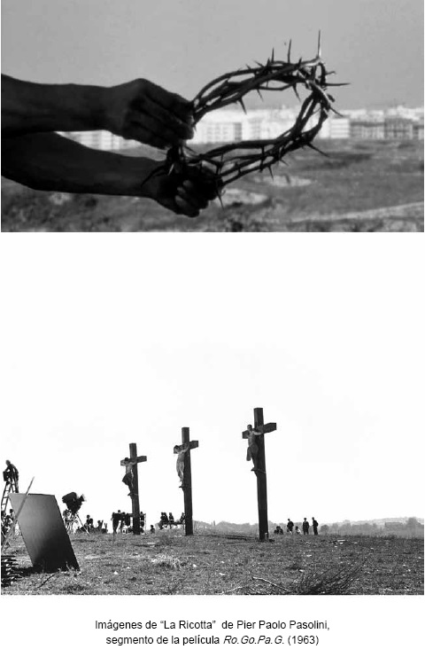 El acercamiento, del todo atinado, de Pasolini a Caravaggio (sobre quien el poeta escribió un ensayo) no excluye la influencia decisiva que Pontorno y Rojo Florentino tuvieron en el poeta de Casarsa. Y me voy a detener en el cortometraje La ricotta (El requesón), episodio de una película colectiva Ro.Go.Pa.G. dirigida por Rossellini, Godard, Pasolini y Gregoretti. Episodio magistral, La ricotta se abre con un estupendo twist bailado por dos gallardos jóvenes que figuran en el reparto. En el cortometraje, que mantiene un ritmo frenético hasta el final, Pasolini recurre alegremente y para el regocijo del espectador a las viejas técnicas del cine mudo, sobre todo del amado "Charlot"-Chaplin.
