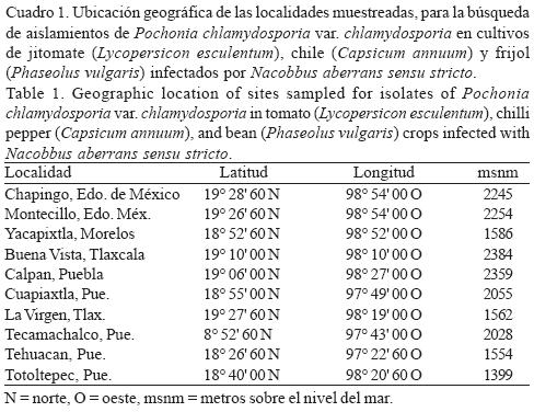 Muestreo. Se colectaron muestras de raíces y suelos en zonas productoras de jitomate, frijol y chile infestados en forma natural con N. aberrans, ubicadas en los estados de México, Morelos, Tlaxcala y Puebla (Cuadro 1). El muestreo se realizó en la temporada de lluvias de verano (19992000). Los muestreos se realizaron con un patrón aleatorio (Barker y Campbell, 1981). El suelo se recogió en la periferia de la raíz, eliminando los primeros 5 cm de suelo, antes de colectar muestras de 100 g entre los 15 y 25 cm de profundidad, además de 50 g de raíces agalladas por punto de muestreo. Las muestras se depositaron en bolsas de polietileno, se etiquetaron y se mantuvieron en una hielera hasta su procesamiento en el laboratorio de nematología del Instituto de Fitosanidad del Colegio de Posgraduados (CP).