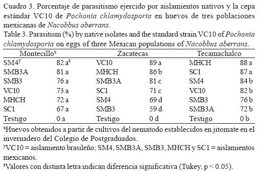 Porcentaje de parasitismo en los huevos. El aislamiento VC10 o aislamiento estándar ejerció el mayor porcentaje de parasitismo (89%) en la población Zacatecas del nematodo, seguido del MHCH (86%) y SMB3 (59%). Para la población Tecamachalco, el mayor porcentaje de parasitismo se obtuvo con el MHCH (88%); y SMB3A (72%), el de menor porcentaje de huevos parasitados (Cuadro 3). Para la población Montecillo, el aislamiento que produjo el mayor porcentaje de parasitismo fue SM4 (82%) y el menor SCI (67%).