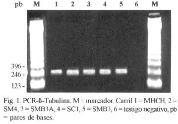 Amplificación del ADN. Las PCR se realizaron en un volumen de 20 μL. Cada solución constó de: 2 μL de 10x tampón de PCR (100 mM TrisHCl, pH 8.3, 500 mM KCl, MgCl2 1.5 mM), 2 μL (0.02 pM) de cada cebador, 0.4 μL de dNTPs (deoxinucleótido trifosfatos), 0.08 μL de Taq polimerasa (5 U μL1) (Taq polimerasa Roche®), 1 μL de DNA y 12.88 μL de agua de alta pureza. La amplificación se hizo en un termociclador (TRIOThermoblock TBI, Biometra®). Las condiciones de PCR se describen a continuación: βtubulinaPCR (Hirsch et al., 2000). Cebadores βtub 1:5' ATG CAA GAA AGC CTT GCG AC3'; βtub 2: 5'TTT GCA GTA TCT CAG TGT TC3'. Condiciones de PCR: 95°C pausa, 35 ciclos [94°C 1 min, 55°C 1 min, 72°C 1 min]; 72°C 5 min. ERICPCR (White et al., 1990). Cebadores ERIC (amplificación de secuencias intergénicas de concenso repetitivas de enterobacterias): R1CIRE: 5' CAC TTA GGG GTC CTC GAA TGT A 3'; ERIC2: 5' AAG TAA GTG ACT GGG GTG AGC G 3'. La concentración de cada cebador fue de 10 pM y la concentración de MgCl2 de 2.5 mM. Las condiciones de amplificación fueron: 95°C pausa, 35 ciclos [1 min a 94°C, 42°C 1 min, 72°C por 1 min]; 72°C 5 min (Atkins y Clark, 2005). ITSPCR (White et al., 1990). Cebadores ITS (espaciadores internos transcritos): ITS 4: 5' GGA AGT AAA AGT CGT AAC AAG G3'; ITS 5: 5' TCC TCC GCT TAT TGA TAT GC3'. Condiciones de PCR: 95°C pausa, 94°C 3 min, 35 ciclos [ 94°C 1 min, 42°C 1.5 min, 72°C 1.5 min]; 72°C 5 min. RFLPPCR (Carder et al., 1993). Las enzimas de restricción para los RFLPPCR (polimorfismo de tamaño de los fragmentos de restricción) fueron Hae III (10 U μL1), Hin F1 (10 U μL1), CfoI (10 U μL1), XbaI (10 U μL1), Nar1 (10 U μL1) y Sau 3A (4 U μL1) (BRL Ltd). La digestión de los productos de ITSPCR se hizo en un volumen de 20 μL. Se adicionaron 2.3 μL del tampón 10x, la enzima(s) de restricción (1 μL) y se incubó 1 h en un baño maría a la temperatura adecuada, de acuerdo a las instrucciones del proveedor. Los productos de la digestión enzimática se corrieron en un gel de agarosa (Helena Biosciences, Sunderland) al 1.5%. RAPDPCR (Folkertsma et al., 1994). Cebador para RAPDPCR (ADN polimórfico amplificado al azar) V17 (Operon Technologies, Alameda, CA): 5'ACC GGC TTG T3'. Las condiciones para PCR fueron: 92°C pausa, 92°C 2 min, 35°C 1 min, 72°C 1 min, 39 ciclos [92°C 1 min, 35°C 1 min, 72°C 1 min ciclo], 92°C 1 min, 35°C 1 min, 72°C 5 min.