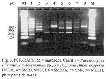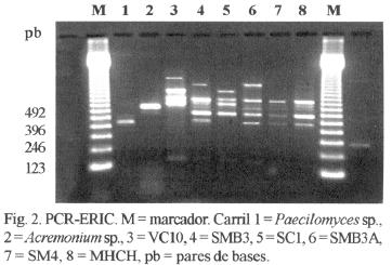 Identificación de aislamientos de P. chlamydosporia con PCR. En el βtubulinaPCR los cinco aislamientos mexicanos y el testigo positivo (VC10) generaron un solo producto de PCR de 270 pares de bases, confirmándose que corresponden a la especie P. c. var. chlamydosporia (Fig. 1), Usando el ERICPCR (Fig. 2), el perfil de bandas mostró distintos grupos: uno formado por MHCH y SMB3 y otro por SMB3A y SM4. El aislamiento SCI parece ser diferente a estos dos grupos. Los cebadores ITS4 y ITS5 indicaron que todos los aislamientos son similares. Los RFLP no mostraron diferencias (datos no presentados). Los perfiles generados con el cebador VI7 sugieren que con RAPDPCR pueden identificarse tres grupos: SCI y SMB3A; SMB3 y MHCH; y SM4 (Fig. 3). Las secuencias de dos de los aislamientos se depositaron en la base de datos GenBank. Los números de acceso son: AY903605 (clave para 476), AY912487 (clave para 472). El análisis de la secuencia del producto de ITSPCR mostró homologías con otras secuencias de P. c. var. chlamydosporia depositadas en GenEmbl.