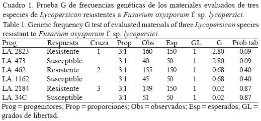 Tomate (Lycopersicon esculentum) production in the states of Sinaloa, San Luis Potosi, and Nayarit, Mexico, es at risk because of wilt disease caused by Fusarium oxysporum f. sp. lycopersici, particularly race Fol3. There are few resistant cultivars despite that this control method is the most economic, effective, and innocuous to manage the disease. Identification of sources of resistance in wild germplasm has gained importance; therefore, the objective of this work was to determine the inheritance of resistance to race Fol3 in three tomato species: Lycopersicon esculentum, L. peruvianum, and L. pimpinellifolium in the greenhouse. Three hundred F2 tomato plants, 1525 days old, from each cross were inoculated by root immersion in a 107 mL L1 conidial suspensión of Fol3; evaluation was carried out 30 days after planting, plants were classified as resistant or susceptible. The G test was used since its goodness of fit allowed to determine if the observed frequencies adjusted or not to the expected ratios. The inheritance of resistance in the six genotypes evaluated was mendelian, with a ratio of three resistant plants with complete dominance to one susceptible.