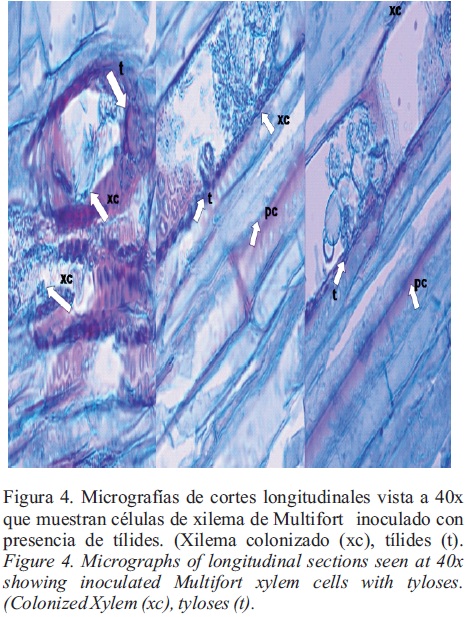 Observaciones histológicas e histoquímicas. En los cortes transversales de lasa raíces se comparó la integridad de los tejidos en el híbrido Imperial sin inocular respecto al inoculado (Figura 2). En este último se aprecia abundante colonización inter e intracelular de micelio de Fusarium oxysporum f. sp. lycopersici raza 3 en la mayor parte del tejido radicular, incluyendo epidermis, corteza, células de parénquima y vasos conductores (Figura 3); sobresaliendo la colonización en células de la corteza; así como la penetración de las hifas de manera intercelular en algunas células de xilema colonizadas intracelularmente, lo que generó severos daños en el tejido inoculado, probablemente debido a toxinas producidas por el patógeno como ácido Fusárico y licomarasmina que actúan matando al protoplasma de las células (Cárdenas, 2005). El estudio histológico de los patrones Vigostar 10 y Multifort revela que la organización celular de las raíces es muy diferente a la organización que presenta el híbrido Imperial, ya que las raíces de Vigostar 10 y Multifort están conformadas por abundante sistema vascular, principalmente de xilema, el cual está distribuido a través de la raíz y una corteza aparentemente de menor grosor principalmente en el caso de Multifort. En la raíz del portainjerto Vigostar 10, se aprecia una corteza de tamaño similar al hibrido Imperial, pero con una mejor delimitación de la corteza. Probablemente este acomodo celular influye en la resistencia preexistente que presentan los patrones, contrario al híbrido Imperial que muestra el sistema vascular discontinuo, encontrándose distribuido en ciertos sectores de la raíz, conformada esta última en su mayoría por tejido parenquimatoso, lo que puede intervenir en la susceptibilidad que presenta este cultivar a Fol 3, ya que la organización del sistema vascular puede tener un efecto en la susceptibilidad relativa de la planta (Beckman y Talboys, 1981). Además, el parénquima está constituido de células vivas con pared celular muy delgada y puede ser desintegrada fácilmente por varias especies de Fusarium, Pythium, Phytophthora y Rhizoctonia (Cárdenas, 2005). El grado de la colonización fungosa fue reducido en tejido de las raíces de las plantas de los portainjertos Multifort y Vigostar 10. Las pocas hifas del patógeno que lograron penetrar al sistema de la raíz, fueron restringidas principalmente a la epidermis y a la corteza externa, mientras que los tejidos internos raramente fueron colonizados. La penetración del patógeno en los tejidos externos de la raíz, se correlacionó con los cambios citológicos caracterizados principalmente por la formación de las aposiciones o barreras físicas formadas por tílides (Figura 4) en vasos de xilema, las cuales son una respuesta de defensa ante la presencia del patógeno (Agrios, 2005). Rojas (1992), menciona que las barreras físicas son los principales mecanismos involucrados en la resistencia de plantas de Lycopersicon esculentum a Fusarium oxysporum f. sp. radisis lycopersici. Resultados similares fueron reportados por García (1994), quien observó la formación de tílides en raíces de plantas de Lycopersicon esculentum cvs. Bonny Best, Contesa y Larma, inoculadas con Fusarium oxysporum f. sp. radicis lycopersici, siendo el material Larma, resistente a este fitopatógeno, donde se presentaron mayor cantidad de tilides, factor que se ha indicado que le confiere la resistencia al fitopatógeno señalado, como se ha indicado.