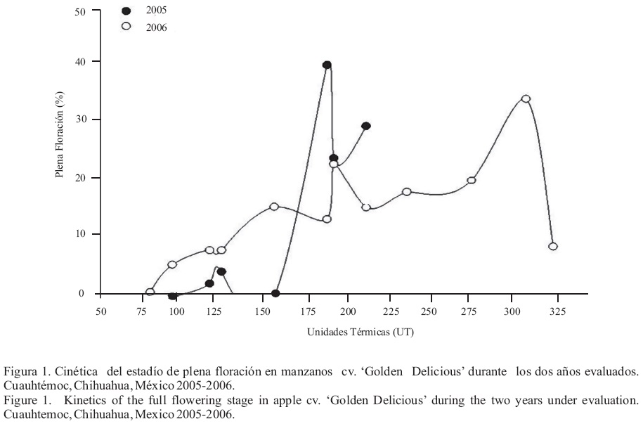 Fenología de floración. El período de floración durante el año 2005 fue más compacto comparado con el ciclo 2006 (Figura1), esto debido a la mayor acumulación de unidades frío (UF) con 979 y 613, respectivamente (UNIFRUT, 2005; 2006). De acuerdo a Hauagge y Cummins (1991), los requerimientos para romper la dormancia apical en manzano 'Golden Delicious', fue superior a las 1000 UF. De igual manera Llamas et al. (2002), mencionan que la escasa acumulación de frío se ve reflejado en una brotación escasa, tardía e irregular. Razón por la cual, el extenso periodo de floración durante el año 2006 dificulta el manejo de Ea, debido a que día a día se abren nuevas flores y son el tejido más susceptible para la infección y al no existir bactericidas sistémicos las flores que abren después de la aplicación no quedan protegidas (Kritzman et al., 2003; Shtienberg et al., 2003).