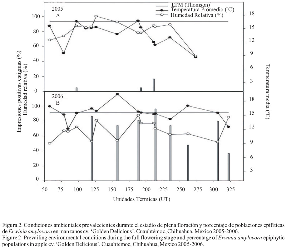 Porcentaje de poblaciones epifíticas de Erwinia amylovora. Los resultados obtenidos en la impresión de estigmas muestran una menor incidencia de flores colonizadas por Ea durante el 2005, con valores de 5, 5 y 17% al acumularse 112, 189 y 212 unidades térmicas (UT), respectivamente (Figura 2). De acuerdo al método de predicción propuesto por Bubán et al. (2004), el mayor riesgo de infección se presentó al acumularse 189 UT, debido a que las temperaturas promedio estuvieron por encima del umbral con 16.7°C (Figura 2), además de ser la única fecha con presencia de lluvia (0.60 mm), registrando una humedad del 78% (UNIFRUT, 2005), mientras que al acumularse 112 UT el riesgo de infección fue moderado (M). El bajo porcentaje de poblaciones epifíticas de Ea durante 2005, se deben posiblemente a las bajas temperaturas registradas durante la evaluación (Figura 2). Estudios realizados por Bubán et al. (2004), atribuyen la ausencia de Ea en cuatro de cinco huertas muestreadas debido a un período frío antes de la floración. Por otra parte, la incidencia de flores colonizadas con Ea durante 2006 registró un mayor porcentaje de poblaciones epifíticas de Ea en todas las fechas de muestreo (Figura 2), debido posiblemente a las altas temperaturas y a la menor acumulación de unidades frío (613) (UNIFRUT, 2006), registradas durante la evaluación, condiciones que favorecieron el establecimiento de la bacteria aunado a un periodo más extenso en la floración (Figura 1). Durante éste año en la parcela experimental no se registraron eventos de precipitación pluvial, prevaleciendo en la mayoría de los muestreos un riesgo de infección moderado por presentar temperaturas mayores a los 15°C (Bubán et al 2004); sin embargo, debido al manejo del productor quien incrementó la humedad por más de una hora mediante la irrigación, modificó el riesgo de infección moderado (M), a la posible ocurrencia de la infección (I). Estudios realizados por Pusey (2000), menciona que la enfermedad inició en las flores solo cuando la humedad y la incidencia fue superior a 77% incluso cuando las aplicaciones de agua fueron seguidas de un periodo de secado inmediato de 52 min. De igual manera menciona que en el huerto la humedad del suelo afecta el potencial de agua del hospedero, por lo que la bacteria podría multiplicarse sobre los estigmas a menor humedad relativa que la que existe en la tasa floral. Por esta razón la aplicación de los tratamientos se realizó a las 214 UT por presentar el mayor porcentaje de flores colonizadas (96%), así como una humedad relativa del 70% (Figura 2). Miller y Schroth (1972) reportaron que el establecimiento de poblaciones epifíticas de Ea sobre los estigmas es un paso crítico para la infección de flores. A la fecha en la región productora de manzana del estado de Chihuahua regularmente se realizan de cuatro a siete aplicaciones durante floración, con productos a base de estreptomicina, dependiendo de las condiciones climáticas (temperatura, lluvia o granizo).