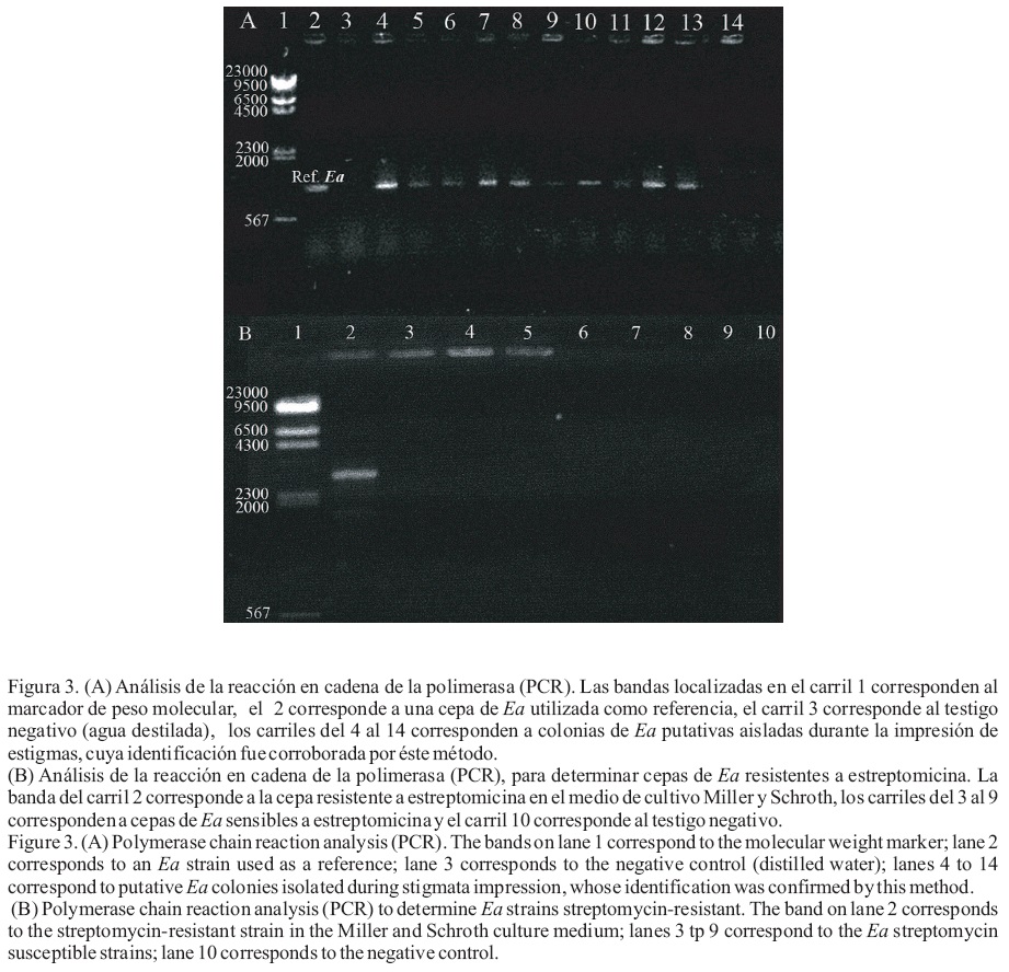 Pruebas de resistencia a estreptomicina por PCR. Al confirmar la resistencia a estreptomicina del aislado obtenido en el medio de cultivo Miller y Schroth (1972), ésta dio positiva al transposon mostrando la banda característica mediante la amplificación (Figura 3B). Resultados similares fueron reportados por Chiou y Jones (1991) al evaluar cepas de Ea resistentes a este antibiótico en medio B de King's con 50 μgmL-1, y posteriormente por PCR conteniendo un plásmido de aproximadamente 3.2 Kb. debido al uso generalizado de estreptomicina para el manejo del tizón de fuego, razas de Ea resistentes a estreptomicina son comunes en varias regiones de estados Unidos. La búsqueda de alternativas que reemplacen o complementen a la estreptomicina es un objetivo importante para investigaciones futuras (Norelli, 2004). La detección de genes resistentes a estreptomicina en bacterias de Ea aisladas en medios de cultivo que contienen éste antibiótico es una fuerte evidencia de la presencia de cepas resistentes en el estado de Chihuahua.