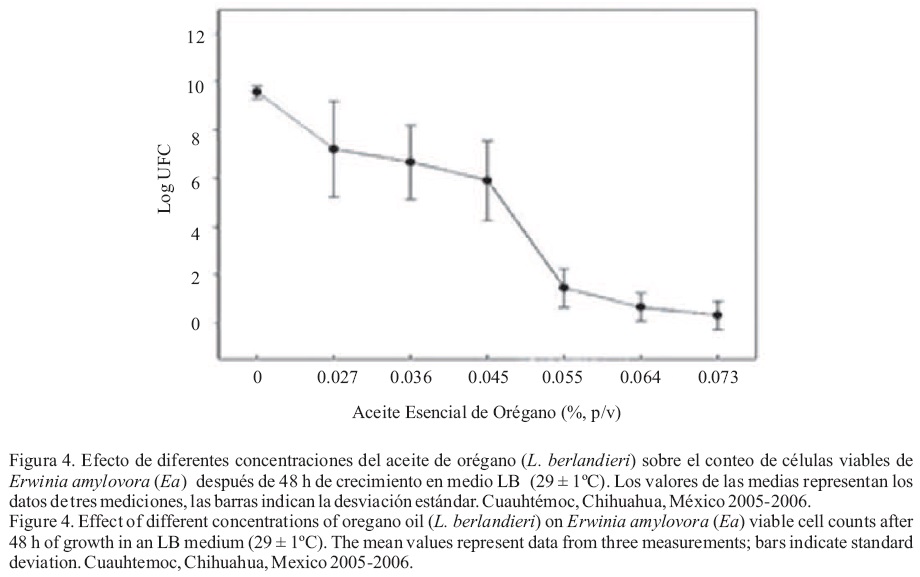 Determinación in vitro de la concentración mínima bactericida (CMB). El aceite esencial de orégano (Lippia berlandieri) con un contenido de 80% de carvacrol usado en este trabajo fue proporcionado por Agroindustrial Don Pablo Licón (www.agrodonpablo.com). La actividad antibacterial se determinó usando diluciones del aceite esencial en agar o caldo, utilizando diferentes emulsificantes para su incorporación al medio de acuerdo a Burt (2004). Como testigo se utilizó una cepa local de Ea aislada previamente. Para la preparación del preinóculo se colocó una concentración de Ea de 1 x 107 UFC mL-1 en un matraz Erlemmeyer con 250 mL de caldo Luria-Bertani (LB). El matraz se mantuvo en agitación constante a 165 rpm y a una temperatura de 29± °C durante 48 h. Transcurrido este tiempo de adaptación se contabilizó la población existente usando una cámara de Neubauer y éste resultado se utilizó para calcular el inóculo final. Se colocaron 100 μL de la suspensión 1x107 UFC mL-1 en los matraces con 250 mL de LB. Transcurrida 1 h se añadieron diferentes porcentajes del aceite esencial de orégano: 0.027, 0.036, 0.045, 0.055, 0.064 y 0.073% (p/v), utilizando como emulsificante un detergente líquido comercial al 0.2% (v/v), posteriormente se colocaron bajo las mismas condiciones de crecimiento que el preinóculo. La viabilidad de las bacterias se determinó por conteo en placa, para lo cual se utilizó 1 mL de muestra y se diluyó con agua peptonada. Las diluciones seriales fueron puestas en medio de cultivo CCT e incubadas por 24 h a una temperatura de 28°C. Todas las pruebas se realizaron por triplicado.