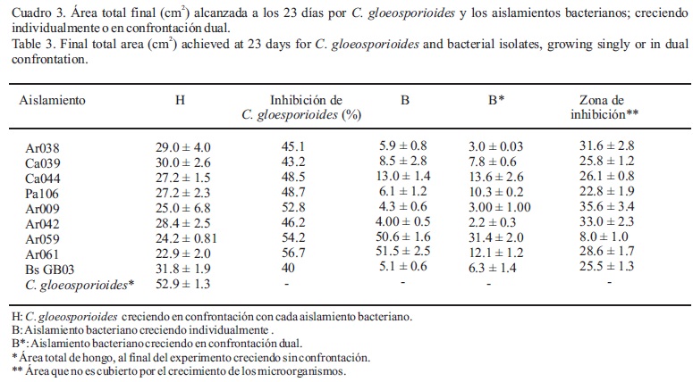 Evaluación cuantitativa del antagonismo de los cultivos bacterianos contra C. gloeosporioides. El antagonismo de los ocho aislamientos hacia el crecimiento de C. gloeosporioides fue evaluado de forma cuantitativa a través del seguimiento diario del crecimiento de los organismos confrontados; tomando como referencia los crecimientos del hongo y de la bacteria creciendo en forma independiente (Figura 2); como se puede observar en la figura, la imagen editada en alto contraste refleja fielmente la imagen digitalizada original. El registro realizado permitió observar el día en que el crecimiento del micelio del hongo se disminuye hacia la colonia (considerando la Figura 3). A partir de ese momento la colonia del hongo comienza a "achatarse" y crece sólo hacia las zonas laterales, fuera de la influencia de la actividad antagónica de los aislados bacterianos (Figura 2A). Esto ocurrió en el día siete en el caso de Ar042, ejemplo mostrado en la Figura 2. En el caso del testigo donde el hongo crece sin antagonistas, la colonia se desarrolló continuamente hasta cubrir por completo el medio de cultivo en el día 23. La digitalización (Figura 2B) permitió convertir la zona cubierta por las colonias, tanto por la bacteria como por el hongo, a un dato preciso de área en cm2, y calcular los parámetros utilizados en este trabajo para comparar la capacidad de los ocho aislamientos como antagonistas; así como hacer un análisis estadístico del fenómeno. La dinámica del crecimiento de C. gloeosporioides en presencia de los ocho aislamientos bacterianos, de la cepa testigo BsGB03, o del hongo creciendo sin antagonistas, se muestra en la Figura 3. Las curvas de crecimiento del hongo en presencia de los antagonistas bacterianos se separan claramente de la curva donde el hongo crece sin antagonistas; esto es evidente, para todos los aislamientos, a partir del día 10. En las imágenes digitalizadas se observó que la interrupción del crecimiento frontal y "achatamiento" de la colonia del hongo ocurrió entre el día siete y nueve, dependiendo del aislamiento (datos no mostrados). En la Figura 4A y el Cuadro 3 se muestra el área final alcanzada por C. gloeosporioides creciendo en confrontación dual con cada uno los ocho aislamientos bacterianos, y en los testigos. En todos los casos el área de crecimiento del hongo es significativamente menor (p<0.001) al crecer en confrontación con respecto al testigo creciendo sin antagonistas. Los aislamientos Ar061 y Ar059 son los que más efecto tuvieron sobre el crecimiento del hongo. Todos los aislamientos mostraron tener mayor efecto inhibitorio que la cepa comercial BsGB03 utilizada como testigo. El porcentaje de inhibición ejercida por cada aislamiento bacteriano sobre el crecimiento de C. gloeosporioides se muestra en el Cuadro 3. Los aislamientos bacterianos que causaron mayor porcentaje de inhibición fueron Ar061, Ar059 y Ar009; con valores de 56.7, 54.2 y 52.8% de inhibición, respectivamente. La cepa testigo BsGB03 sólo inhibió el 39.9 % del crecimiento del hongo, valor inferior al obtenido con cualquiera de los aislamientos nativos evaluados.