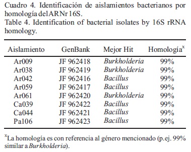 El análisis molecular basado en la comparación de las secuencias bacterianas del gene ribosomal 16S (ARNr 16S) permitió una identificación precisa a nivel de género de los ocho aislamientos antagonistas aquí identificados, indicando que tres de ellos pertenecen al género Burkholderia (Ar009, Ar038 y Ar061) y cinco al género Bacillus (Ca044, Pa106, Ar042, Ar059 y Ca039). Aunque el gene ARNr 16S es altamente conservado, diferencias mínimas a lo largo de su secuencia son significativas desde el punto de vista biológico, y son suficientes para permitir clasificar los organismos en grupos específicos en base a su homología. El análisis filogenético, mostró que los aislamientos Ar061 y Ar038 son bacterias ubicadas dentro del grupo de Burkholderia lata, mientras que Ar009 es más similar a Burkholderia cepacia. Los aislamientos Ar042, Ca039 y Ar059, fueron ubicados dentro del grupo de Bacillus cereus (Maughan y Van der Auwera, 2011); Ca044 es similar al grupo de Bacillus subtilis; y Pa106 se asocia al grupo de Bacillus pumilus. Sobre el comportamiento antagonista, las especies aquí referidas del género Bacillus han sido ampliamente evaluadas no solo en su capacidad como antagonistas a fitopatógenos, sino como promotoras del crecimiento y del rendimiento en plantas (Besson y Michel, 1990; Sandrin et al., 1990; Eshita et al., 1995; Kajimura et al., 1995). De las especies B. pumilus y B. cereus hay numerosos reportes como habitantes naturales de la rizósfera de plantas y con antagonismo demostrado hacia hongos fitopatógenos (Eshita et al., 1995). La especie Burkholderia cepacia se ha reportado como habitante natural en la endorizósfera de una gran variedad de plantas y con una fuerte actividad antagónica (Whipps y Lynch, 1985; Ramette et al., 2005; Mendes et al., 2007; Vandamme et al., 2007; Jacobs et al., 2008). Actualmente estamos confirmando la identidad a nivel de especie con base en pruebas microbiológicas estándares.