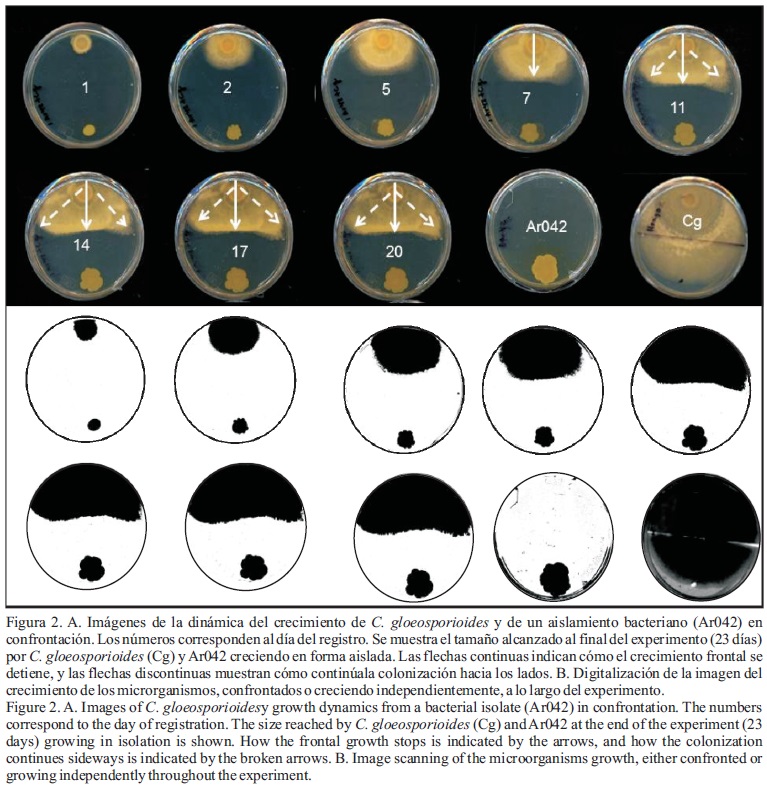 Entre los mecanismos reportados por bacterias para la inhibición del crecimiento en hongos, se menciona la generación de metabolitos inhibidores liberados al medio circundante, y la inhibición por competencia (de Weger et al., 1986; Juhnke et al., 1987; Besson y Michel, 1990; Eshita et al., 1995). No fue objetivo de este trabajo identificar el mecanismo de inhibición de los aislamientos evaluados. Sin embargo, los resultados observados durante el desarrollo de C. gloeosporioides en confrontación con los aislamientos Ar009, Ca044, Ar042, Ar038, Ca039 y Pa106 sugieren que el micelio del hongo detiene su crecimiento frontal cuando alcanza la zona de inhibición generada por estos aislamientos, debido a que en dicha zona podría existir una concentración efectiva de metabolitos con la capacidad de inhibir el crecimiento del hongo, secretados por la bacteria antagonista hacia el medio de cultivo. A partir de ese punto el hongo solo puede crecer hacia las zonas laterales, donde los metabolitos inhibidores se encuentran en menor concentración, o no existen. Pa106, al detectar la presencia del hongo (por posibles metabolitos del hongo), responde emitiendo los lóbulos. Este tipo de respuesta se ha descrito para algunas especies de Bacillus (Seenesi et al., 2002; Ingham and Ben-Jacob, 2008), género al cual pertenece Pa106. La alteración observada en la coloración de las colonias fúngicas crecidas en confrontación con algunos de los aislamientos bacterianos (Figura 5), posiblemente se debe a reacciones diferenciales del hongo ante los distintos metabolitos que produce cada aislamiento. En cambio, Ar061 y Ar059, bacterias de crecimiento invasivo (Figuras 5 y 6), presentaron un posible antagonismo por competencia de nutrientes y/o de espacio, comportamiento reportado ya para otras especies (Lam et al., 2009). En estos dos casos se registró un antagonismo mutuo entre el hongo y los aislamientos, ya que el hongo también ejerció un importante efecto inhibitorio sobre el crecimiento de las bacterias, este hecho también ha sido reportado (Ansari et al., 2005). La presencia de un halo de inhibición en estas confrontaciones, aunque fue de área muy limitada, muestra que también hay un efecto de antibiosis.