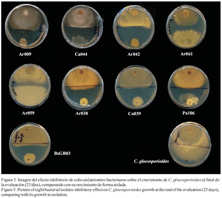 Un total de 278 aislamientos bacterianos obtenidos de la rizósfera de cultivos tropicales fueron evaluados in vitro para determinar su capacidad para inhibir el crecimiento de Colletotrichum gloeosporioides. Sólo 31 aislamientos mostraron actividad antagónica con diferentes grados de inhibición. Ensayos cualitativos en confrontación dual, resultaron en la selección de ocho aislamientos con mayor capacidad de inhibición. Para evaluar cuantitativamente la inhibición del crecimiento de C. gloeosporioides, se estableció un método basado en estandarizar el inóculo inicial de ambos microorganismos y en digitalizar diariamente el área de crecimiento, tanto de la bacteria como la del fitopatógeno creciendo bajo condiciones de confrontación dual o sin antagonistas. El método permitió comparar la capacidad de inhibición de los ocho aislamientos contra la cepa comercial GB03 de Bacillus subtilis; considerando el área de crecimiento del hongo, el crecimiento máximo de las colonias, el tiempo en que inicia el antagonismo, la tasa promedio de crecimiento del hongo, el porcentaje de inhibición, y la zona de inhibición en cada confrontación. Los aislamientos fueron identificados molecularmente mediante secuenciación parcial del gene ribosomal ARNr 16S. Los aislamientos pertenecen a los géneros Bacillus y Burkholderia. Estos parámetros permitieron identificar cuatro aislamientos que poseen el mayor potencial para ser evaluados en campo.