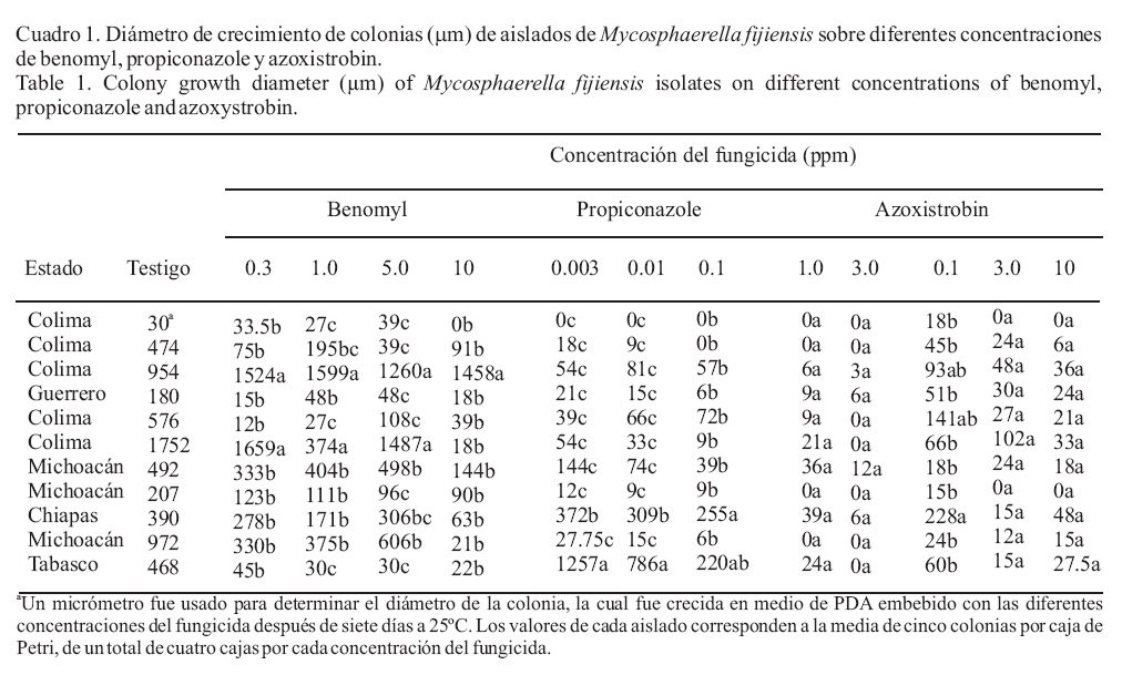 Los aislados fueron obtenidos de las regiones productoras de banano de Mycosphaerella fijiensis pertenecientes a los estados de Chiapas, Tabasco, Michoacán, Colima y Guerrero. Los fungicidas evaluados fueron benomyl, propiconazol y azoxistrobin. Por otra parte, el análisis de sensibilidad a los fungicidas presentó la pérdida de sensibilidad de 10 aislados a benomyl, siete a propiconazol y nueve a azoxistrobin. Dichos aislados fueron capaces de crecer a las concentraciones que indican la pérdida de sensibilidad. De acuerdo con los resultados de esta investigación, es importante acatar las recomendaciones para el uso de los fungicidas a fin de evitar fallas en el control de la enfermedad. En el caso del benomyl, su uso deberá ser restringido en las localidades que presentaron aislados resistentes.