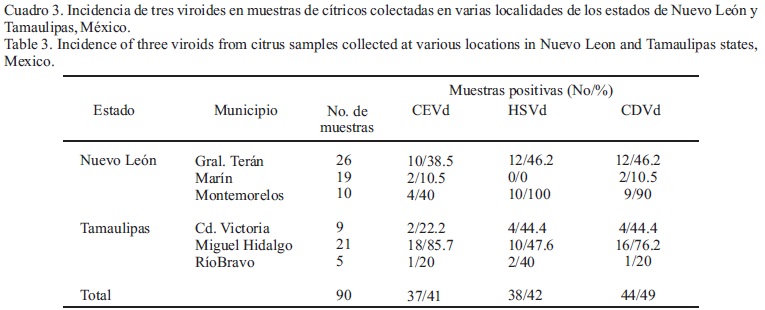 Detección por RT-PCR Punto Final y Tiempo Real de Tres Especies de Viroides en Cítricos de Nuevo León y Tamaulipas, México