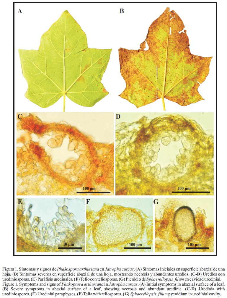 Phakopsora arthuriana se ha reportado previamente en distintas especies del género Jatropha en países de América como Brasil, Colombia, Costa Rica, Cuba, EEUU, Panamá, Perú, Puerto Rico, República Dominicana y Venezuela (Buriticá, 1999). En Brasil, Gomes-Carneiro et al. (2009), Vieira-Junioret al. (2009) y Kobayasti et al. (2011) recientemente documentaron a P. arthuriana causando defoliación total del tercio inferior y parcial del tercio medio de plantas de J. curcas en huertos comerciales para la producción de biocombustible. En Baja California, México, Buriticá (1999) reportó a P. arthuriana en hojas de Jatropha canescens (Benth.) Müll. Arg, sin embargo, este es el primer reporte de P. arthuriana en Jatropha curcas en México.