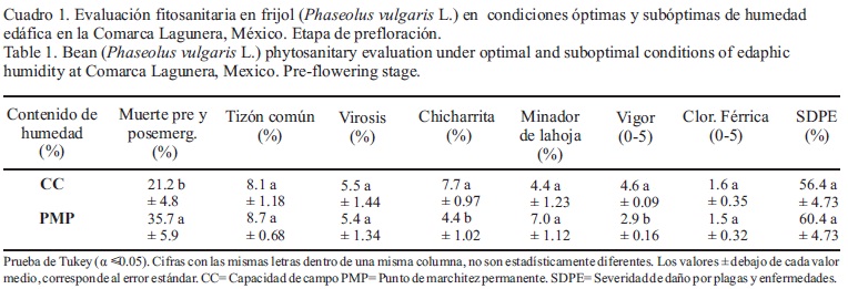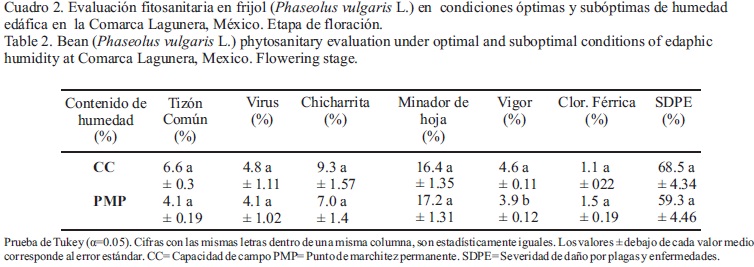 Pest, plant diseases and drought are the main problems in the production of beans. The objective of this study was to evaluate, from a plant health perspective, the response of different bean cultivars to Field Capacity (FC), and Permanent Wilting Point (PWP) of soil moisture. A randomized complete block design arranged in split-plot treatments was used. The main insect pests were the leafhopper (Empoasca kraemeri) and the leaf miner (Xenochalepus signaticollis). The main plant diseases during the season were the pre and post-emergence plant death (Rhizoctonia solani and Fusarium sp.), common blight (Xanthomonas phaseoli) and bean common mosaic virus (BCMV). No significant interaction effect was detected between factors. Mayocoba bean cultivar was significantly more affected in pre and post-emergence plant death (62.5 %), but less damaged by common blight. In general, the pre and post-emergent plant death was higher (35.7 %), when the plant soil moisture was near to PWP, associated to less conductance and transpiration, but higher photosynthetic efficiency, compared to when soil moisture was near FC. Pinto Americano cultivar was able to maintain photosynthesis stability to the change of optimum to suboptimum soil content.