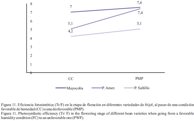 El análisis fisiológico por variedad y de acuerdo a los principios de la resistencia filogenética a factores de estrés, aquél material que disminuya menos sus características agronómicas y/o fisiológicas al pasar de una condición de humedad edáfica favorable (próxima a CC) a otra condición de humedad desfavorable (próxima a PMP), será el de mayor perspectiva, dado que su selección se hace en función del genotipo promedio, de ambas condiciones de humedad (Pedroza, 1995). Con este enfoque, la variedad Pinto Saltillo es la que mantiene un comportamiento fisiológico de mayor actividad, respecto a las otras dos variedades, tanto en fotosíntesis, conductancia, como en transpiración (Figuras 8, 9 y 10); aunque en términos de eficiencia fotosintética la situación se invierte, donde la variedad Mayocoba sobresale como la de mejor respuesta, en tanto que la Pinto Saltillo pasa a ser el material genético de menor eficiencia (Figura 11). Lo anterior indica que Mayocoba, tiene una baja actividad fisiológica en ambas condiciones, lo cual puede estar asociado a la clorosis férrica que manifestó (Figura 10). Sin embargo, tiene alto potencial de eficiencia fotosintética ante condiciones de estrés hídrico, aunque con un bajo índice de productividad de biomasa, por la baja actividad fotosintética (Núñez et al., 1998). El Pinto americano fue el que mostró mayor estabilidad de respuesta, el cual, aunque con valores fisiológicos intermedios entre las otras dos variedades, no solamente mantuvo sus actividad fisiológica al pasar de una condición de humedad a otra, sino que en algunos casos las incrementó al pasar a la condición desfavorable, como lo fue en términos de eficiencia fotosintética y en temperatura de la hoja (Figuras 8 y 12, respectivamente). Información similar se ha reportado previamente en relación a la disminución de la actividad fotosintética, conductancia y transpiración, al disminuir la humedad del suelo, pero con un incremento en la eficiencia fotosintética (µmolCO2m-2s-1; mmolH20m-2s-1) y el incremento en la temperatura de la planta (French and Turner, 1991; Tezara et al., 1999; Lawlor and Cornic, 2002; Casierra-Posada y Roa, 2006). Lo anterior, posiblemente debido a una mayor actividad metabólica y respiratoria, lo que debe repercutir en una mayor producción de biomasa y por ende de rendimiento (Núñez, et al. 1998), sin que ello signifique una pérdida significativa de su tolerancia al estrés hídrico. En resumen, la variedad Pinto Americano es la de mayor perspectiva en términos de tolerancia a las plagas y enfermedades y al estrés hídrico.