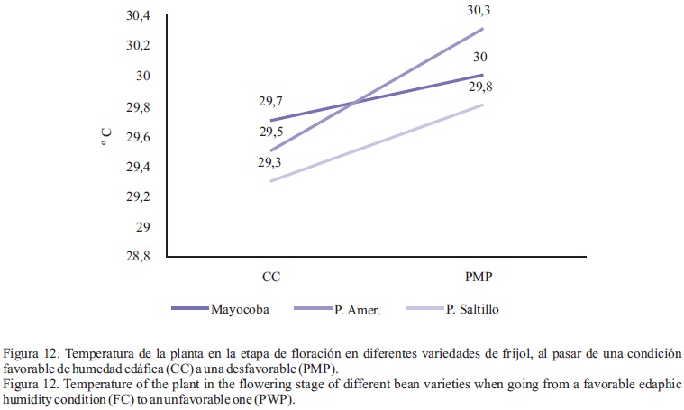 Efecto por separado y de interacción variedades-contenidos de humedad edáfica en la fisiología de la planta. La tasa de fotosíntesis no se afecta por el contenido de humedad edáfica, ya que es menos sensible que otros procesos al estrés hídrico (RODAS, s/f); aunque la conductancia y la transpiración son menores cuando el contenido de humedad es cercano a PMP. Derivado de lo anterior, la eficiencia fotosintética se incrementa en este nivel de contenido de humedad, lo mismo que la temperatura de la planta (Cuadros 2 y 3). Lo anterior sugiere que, aunque no hay una variación en la fotosíntesis, ésta tiende a ser más eficiente, al haber una menor transpiración, dada la menor conductancia, a pesar de incrementarse la temperatura de la planta, lo cual significa que aunque se produzca un cierre estomático, la fotosíntesis se mantiene gracias al posible suministro de CO2 por el proceso de la fotorespiración (Tambussi, 2004; RODAS, s/f.).