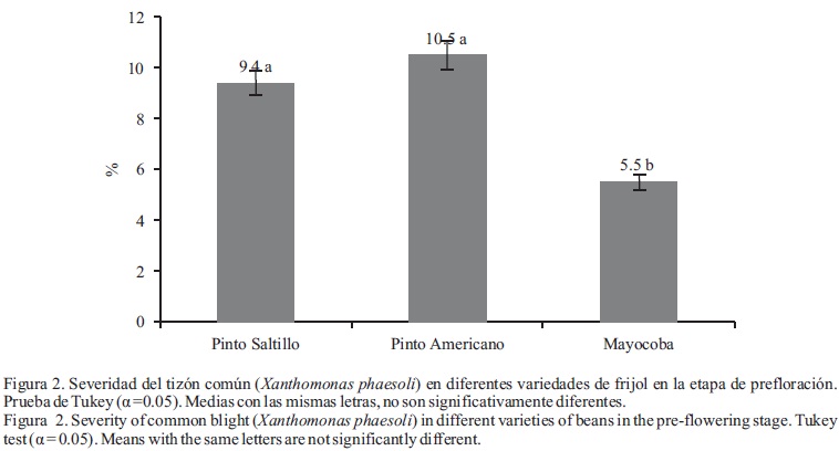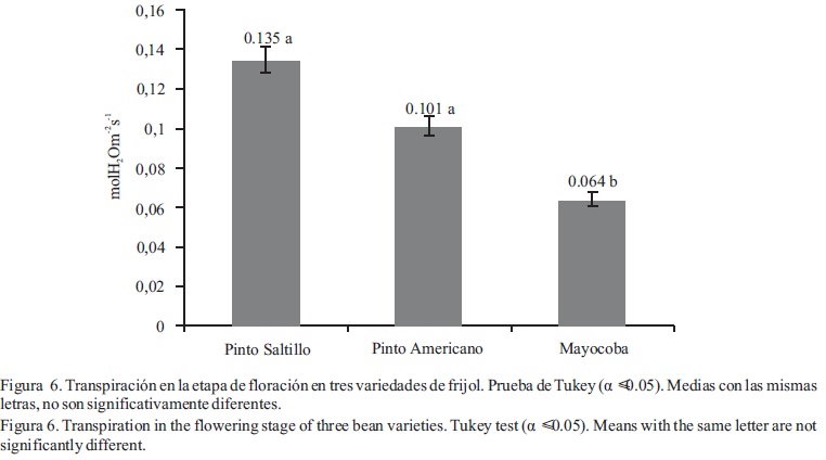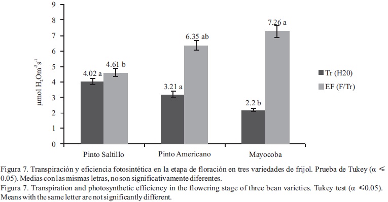 Efecto de variedades en el patosistema del frijol. La variedad Mayocoba fue significativamente (P ≤0.05) más afectada por muerte pre y posemergente (62.5 %), con respecto al 11 y 7.5 % de incidencia identificada en Pinto Saltillo y Pinto americano, respectivamente (Figura 1). La severidad del tizón común fue significativamente menor (P ≤ 0.05) en Mayocoba, en la fase de prefloración (Figura 2). En la fase de floración, las tres variedades registraron el mismo nivel de severidad. La virosis fue moderada en general en los tres materiales genéticos y en las dos etapas de evaluación. El daño por chicharrita, aunque moderado fue significativamente menor en la variedad Mayocoba durante la fase de floración (Figura 3); pero esta variedad presentó una clorosis férrica significativamente mayor (Figura 4). Lo anterior, indica que esta última variedad tiene una alta susceptibilidad a la deficiencia férrica, provocada por la indisponibilidad de Fe que se produce en suelos alcalinos (Ortiz-Villanueva y Ortiz, 1990), lo cual es una característica muy generalizada en la región de estudio (Martínez et al., 2000). Como complejo fitosanitario (severidad de daño por plagas y enfermedades) no hubo diferencia estadística entre variedades en ninguna de las dos fases fenológicas, lo cual coincide con lo reportado por Pedroza (1996). Respecto al vigor, no hubo diferencias significativas entre las tres variedades baja actividad fotosintética, transpiración y conductancia estomática (Figura 5 y 6), probablemente debido al bajo contenido de clorofila producto de la clorosis férrica, la cual fue del orden de 2.3 en una escala de 0 a 5, respecto a la manifestada en las variedades Pinto Satillo y Pinto Americano, que fueron de 0.66 y 0.94, respectivamente. Sin embargo, producto de dicho comportamiento de respuesta, la variedad Mayocoba tendió a ser más eficiente en el uso del agua (Figura 7). Lo anterior asociado al cierre estomático identificado por la menor conductancia y transpiración, similar a lo reportado por Núñez et al. (1998) que, aunque afecta también negativamente a la fotosíntesis, la eficiencia de ésta en relación al uso del agua, fue mayor (Tambussi, 2004). Finalmente, no hubo diferencias significativas en la temperatura de la hoja entre las tres variedades.